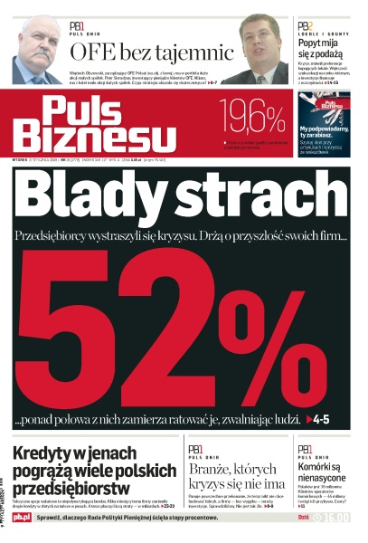 Eureko mrugnęło jako pierwsze i jest szansa na polubowne załatwienie sporu ze skarbem państwa o PZU, w obliczu coraz poważniejszego kryzysu ponad połowa polskich firm chce zwalniać pracowników, strategie zarządzających funduszami emerytalnymi, rządowy projekt komputera dla ucznia ma coraz mniej entuzjastów, po toksycznych opcjach firmy odkryły koszmar umów na kredyty w jenach, efektowny początek tygodnia na GPW.