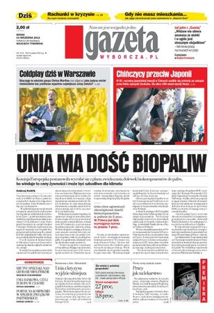 Komisja Europejska postanowiła wycofać się z planu zwiększania dolewek biokomponentów do paliw, bo winduje to ceny żywności i może być szkodliwe dla klimatu; w 81. rocznicę japońskiej inwazji w Chinach nasiliły się protesty po zakupie przez Tokio wysepek Senkaku, na ulice 100 miast wyszły tłumy; rachunki w kryzysie – na czym możemy oszczędzić; czy Unia z kryzysu wyjdzie silniejsza; dlaczego to właśnie grupa Coldplay bez problemu wypełnia największe areny świata.