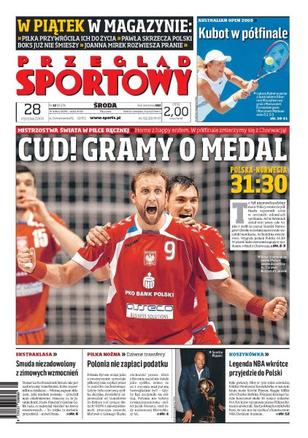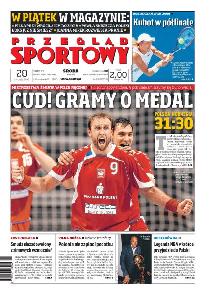 Polacy zagrają w półfinale MŚ w piłce ręcznej; wywiad z Arturem Siódmakiem, bohaterem meczu z Norwegią; Polonia Bytom jako stowarzyszenie wciąż sprzedaje piłkarzy, dzięki temu nie musi płacić podatku od zysku; rozmowa z pomocnikiem Górnika Zabrze, Pawłem Strąkiem; trener Smuda jest niezadowolony z zimowych transferów; na korcie nie ma litości - mówi Łukasz Kubot; Paulina Ligocka opowiada o przygotowaniu do igrzysk i znaczeniu rodziny.