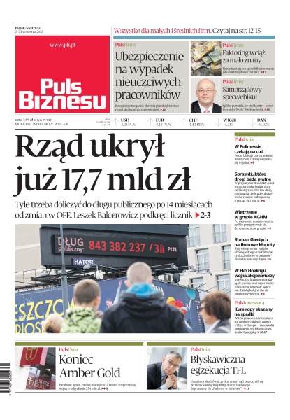 Ubezpieczenie na wypadek nieuczciwych pracowników – specjalistyczne polisy chronią przedsiębiorstwo przed skutkami sprzeniewierzeń; rząd ukrył już 17,7 mld zł – tyle trzeba doliczyć do długu publicznego po 14 miesiącach od zmian w OFE; Pekao blokuje porozumienie wierzycieli – dzisiaj wszystko się wyjaśni; wietrzenie w grupie KGHM – spółka przygotowuje się do remanentu w grupie; w Eko Holdingu wojna akcjonariuszy.