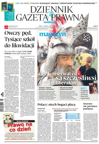Do 2014 roku z mapy Polski może zniknąć nawet pięć tysięcy szkół; jak przed terminem rozwiązać umowę z operatorem sieci komórkowej; czy konserwatyści są szczęśliwsi od liberałów; większość z nas chciałaby zwiększenia wydatków na takie dziedziny, jak pomoc społeczna lub polityka prorodzinna; internet nie powinien pamiętać.