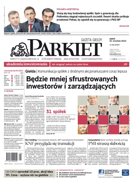 Komunikacja spółek z drobnymi akcjonariuszami coraz lepsza – będzie mniej sfrustrowanych inwestorów i zarządzających; Polimex-Mostostal – ważą się losy budowlanej spółki, spór o gwarancję dla Polimeksu sięgnął najwyższych szczebli; PMI straszą słabością – banki centralne niewiele pomogą; DM IDMSA sprzedał 10 proc. akcji Idea TFI.