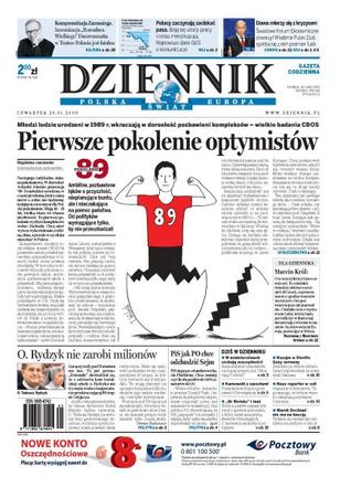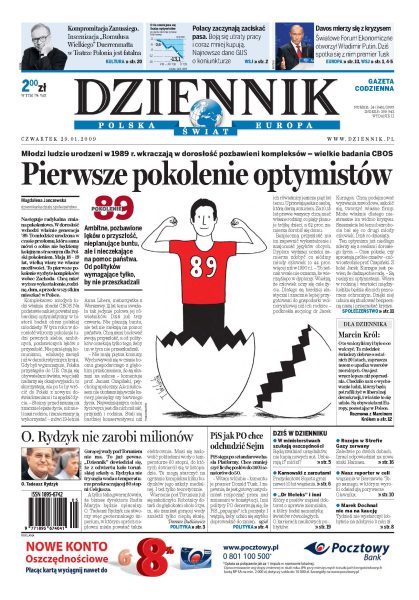 PiS sięga po pomysł PO i chce zmniejszyć liczbę parlamentarzystów; w ministerstwach szukają oszczędności; zamiast gorących źródeł ekipa zatrudniona przez ojca Rydzyka znalazła ciepłą skałę; posłowie nie zrezygnują z 400 zł podwyżki; czy USA wycofa się z budowy tarczy antyrakietowej; prezydent Sopotu zatrzymany za korupcję; Marek Dochnal zbiera na kaucje, na razie bezskutecznie; transakcje w sieci to marsz przez pole minowe; premier Putin otworzył Światowe Forum Ekonomiczne w Davos. Dodatki: The Wall Street Journal, Warszawa, Kurtyna.