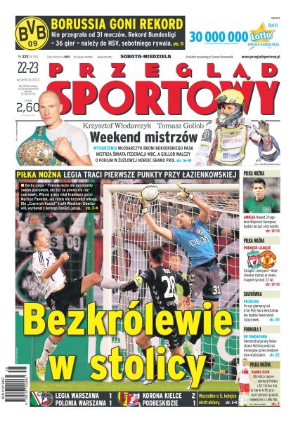 Walka, charakter, niezła gra w piłkę – derby Warszawy na pewno nie rozczarowały; kieleccy kibice mogą odetchnąć: po blisko pół roku doczekali się wygranej swoich piłkarzy na własnym stadionie i pierwszego zwycięstwa w tym sezonie; w sobotnim klasyku Bundesligi Hamburger SV zrobi wszystko, by przerwać niesamowitą serię Borussii Dortmund, która jest niepokonana od 31 meczów; Diablo broni tytułu mistrza świata wagi junior ciężkiej, a rywal naszego boksera zapowiada wojnę – we wrocławskiej Hali Stulecia czeka nas wielkie widowisko; z powodu obfi tych opadów deszczu wczorajszy trening na torze w Vojens został odwołany; po raz pierwszy od ośmiu lat PGE Skra Bełchatów nie będzie faworytem rozgrywek o mistrzostwo Polski; podczas treningu przed Grand Prix Singapuru Sebastian Vettel nie pozostawił rywalom złudzeń – słabszy występ na torze Monza to był wypadek przy pracy.