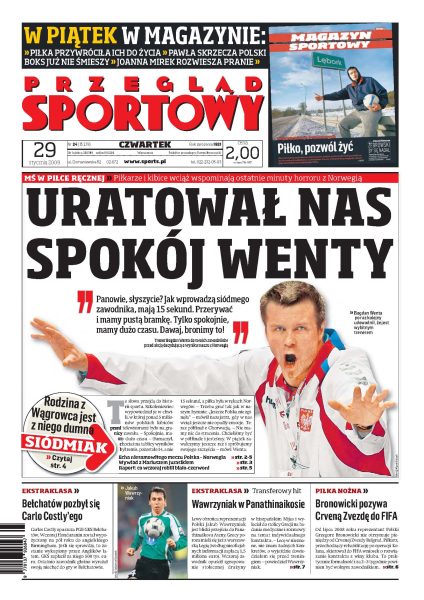 Spokój trenera Wenty pomógł wygrać mecz z Norwegią; rozmowa z Arturem Jurasiakiem; sylwetka Artura Siódmiaka; jutro o 20:30 półfinałowy mecz z Chorwacją; Grzegorz Bronowicki poprosił FIFA o pomoc w rozwiązaniu kontraktu z Crveną; komisja antydopingowa odwiedziła na treningu zawodników Lecha Poznań; Serena Williams jako jedyna spoza Rosji dotarła do półfinału w Melbourne; wywiad z Adamem Małyszem.