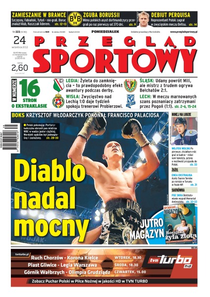 Krzysztof Włodarczyk po wyrównanej walce wygrał w rewanżu z Francisco Palaciosem i po raz czwarty obronił pas mistrza świata WBC w junior ciężkiej; mimo polskich asyst dortmundczycy prze-grali po raz pierwszy od 370 dni; Perquis zagrał w zwycięskim meczu Betisu; dany powrót Mili do składu Śląska Wrocław, ale mistrz z trudem ograł Bełchatów 2:1; zwycięstwo nad Lechią 1:0 daje tydzień spokoju trenerowi Probierzowi; bełchatowianie wygrali Memoriał Ambroziaka.