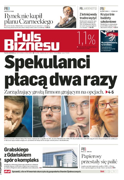 Zarządzający TFI grożą przedsiębiorcom uwikłanym w toksyczne opcje sprzedażą akcji oraz pozwami o odszkodowania, Maciej Grabski spiera się z władzami Gdańska o plac pod budowę biurowca, sprzedaż papierosów w Polsce spadła w zeszłym roku o 10%, Roman Karkosik chce wejść w TelForceOne - kurs spółki oszalał, planowana fuzja Getin Banku i Noble Banku nie wzbudziła entuzjazmu analityków i inwestorów, rośnie ryzyko funduszy obligacji dolarowych.