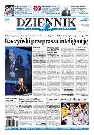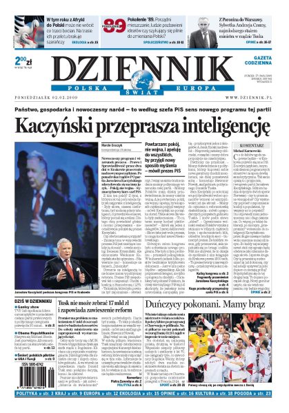 Jarosław Kaczyński przeprosił inteligencję; premier ma problem ze znalezieniem 17 mld zł oszczędności w budżetach resortów; nasi piłkarze ręczni pokonali wczoraj Danię 31:23 i zdobyli brąz mistrzostw świata; dziś Declan Ganley otwiera w Warszawie pierwsze biuro ugrupowania Libertas; polscy piloci zginęli w Turcji i USA; Juszczenko obarczył Julię Tymoszenko winą za katastrofalną sytuację gospodarczą Ukrainy; po raz pierwszy w historii na czele Partii Republikańskiej USA stanął Afroamerykanin; Andrzeja Czumy droga do resortu sprawiedliwości. Dodatki: The Wall Street Journal, Warszawa, Praca.