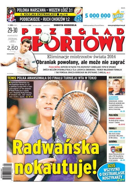 Agnieszka Radwańska awansowała do finału turnieju WTA w Tokio; Aleksander Wierietielny, szkoleniowiec Justyny Kowalczyk opowiada o przygotowaniach do sezonu i końcu swojej kariery trenerskiej; w sobotę derby Londynu: Arsenal-Chelsea; Lewis Hamilton przechodzi z McLarena do Mercedesa.