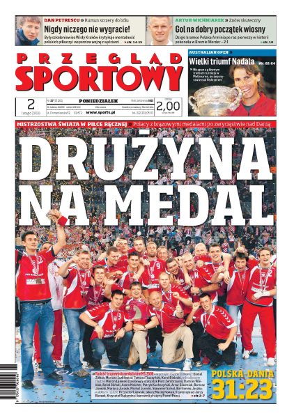 Polacy brązowymi medalistami MŚ w piłce ręcznej, Francja zdobyła złoto; Liverpool pokonał Chelsea 2:0; Wichniarek strzelił gola Werderowi i pomógł wygrać Arminii Bielefeld; rozmowa z Marcinem Wasilewskim, obrońcą reprezentacji Polski; polscy piłkarze nigdy nie będą mistrzami świata - wywiad z Danem Petrescu; Dawid Jarka mówi o swojej grze w Górniku Zabrze; Serena Williams po raz czwarty wygrała w Melbourne Park; Rafael Nadal pokonał Rogera Federera.