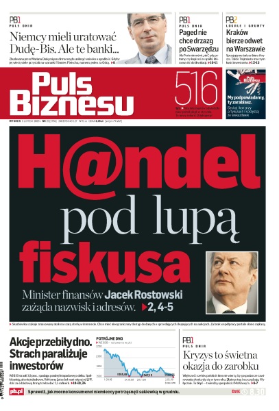 Ministerstwo Finansów chce nieskrępowanego dostępu do danych identyfikujących osoby podejrzane o nielegalny handel w internecie, szefowie firm różnie prognozują koniec kryzysu – 2010, 2011..., auta mają zdrożeć przy jednoczesnym spadku sprzedaży, Duda-Bis miał szansę znaleźć potężnego inwestora, Swarzędz chce się poddać – akcje spikowały w dół, WIG20 zjechał poniżej jesiennego dołka, od stycznia Lotos stracił aż 40%.