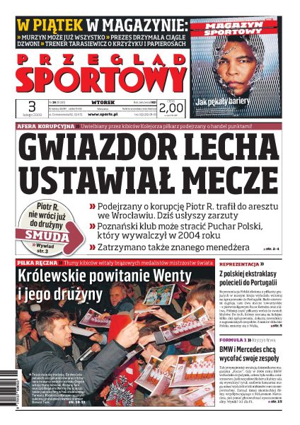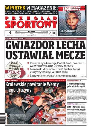 Gwiazda Lecha Poznań, Piotr R., trafił do aresztu podejrzany o korupcję; wywiad z Franciszkiem Smudą; zawodnicy polskiej ekstraklasy polecieli na zimowe zgrupowanie do Portugalii; działacze Legii wciąż szukają następcy Wawrzyniaka; Wisła Kraków utrzymuje zawodników, z których nie ma pożytku; Krzynówek odszedł z Wolfsburga do Hannoveru 96; Damian Wleklak dobrą grą zamknął usta krytykom; wywiad z Ireneuszem Mazurem; bukmacherzy wierzą, że Rafael Nadal może zdobyć Wielkiego Szlema.
