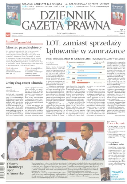 Lotus – tak ma się nazywać fundusz lotniczy, który uruchomi powiązana z Agencją Rozwoju Przemysłu spółka MS TFI; jak można najkorzystniej sfinansować założenie start-upu; nasila się spór o dochody jednostek samorządu terytorialnego – gminy i miasta mają dość otrzymywania zadań bez pieniędzy i zmian, które uderzają w ich finanse; firmy muszą oddawać zatrudnionym wolne w innym terminie, jeśli święto przypadnie w ich dzień niepracujący; wzrost gospodarczy, walka z bezrobociem, ograniczenie deficytu budżetowego, stawki podatkowe, świadczenia socjalne oraz reforma systemu opieki zdrowotnej to główne tematy pierwszej debaty między Barackiem Obamą a Mittem Romneyem, która dziś w nocy polskiego czasu odbędzie się w Denver.