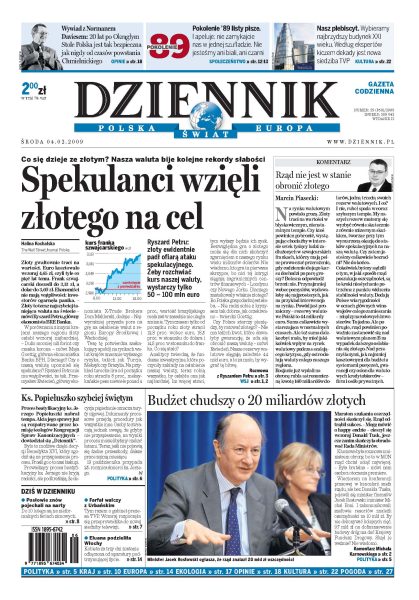 Złoty gwałtownie traci na wartości; rząd znalazł 20 mld oszczędności; Benedykt XVI zgodził się na przyspieszenie procesu beatyfikacyjnego ks. Popiełuszki; jest projekt ustawy o przeciwdziałaniu przemocy w rodzinie; polscy żołnierze oskarżeni o popełnienie zbrodni wojennych; Włosi walczą o los kobiety, która od 17 lat jest w śpiączce; najsłynniejsza na świecie prywatna armia ma kłopoty z prawem; rozmowa z Normanem Davisem; wywiad z Piotrem Świerczewskim, byłym zawodnikiem Lecha Poznań. Dodatki: The Wall Street Journal, Warszawa.