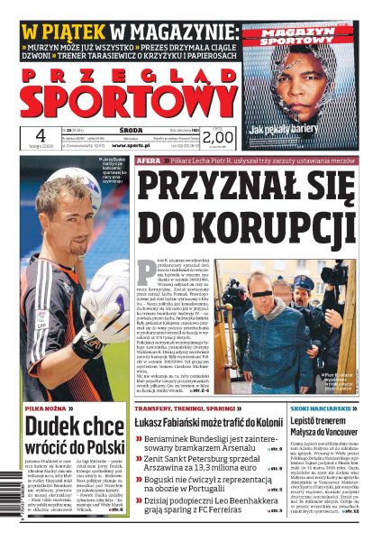 Piotr R. przyznał się do zarzutów o korupcję i wyszedł za kaucją; afera korupcyjna zaszkodzi Lechowi tylko, jeśli PZPN uzna że obecny klub musi odpowiadać za błędy poprzedniego właściciela; Beenhakker jest zadowolony z reprezentantów; wywiad Łukaszem Trałką, pomocnikiem Lechii Gdańsk; rozmowa z Jerzyn Dudkiem; lubię szachy na korcie - mówi Mats Wilander; Lepisto będzie trenerem Małysza do igrzysk w Vancouver; Agata Wróbel wraca do sportu, wcześniej jednak czeka ją operacja.