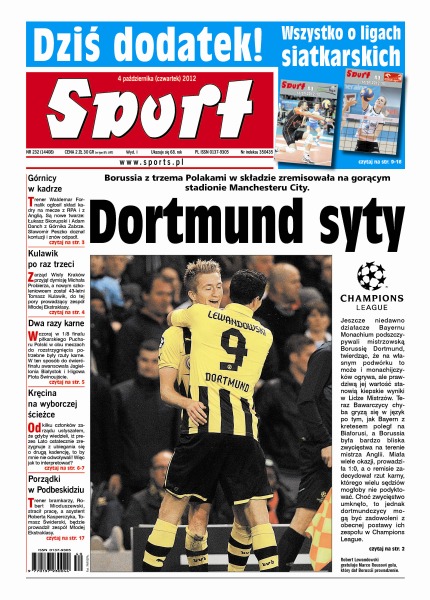 Borussia z trzema Polakami w składzie zremisowała na gorącym stadionie Manchesteru City; z siedmiu graczy polskiej ligi powołanych na mecze z RPA i Anglią po dwóch jest z Legii i Górnika; nie istnieli 15 lat, a gdy powstali na nowo, zostali najlepszym klubem Białorusi – we wtorek odnieśli największy międzynarodowy sukces, pokonując Bayern Monachium; dziś Polki rozpoczną walkę o awans do mistrzostw świata, które w 2013 r. odbędą się w Serbii; Maciej Kot był czwarty w końcowych zawodach Letniej Grand Prix w Klingenthal; Agnieszka Radwańska w Pekinie po przegraniu pierwszego seta z Hiszpanką, Lourdes Dominguez Lino, pokazała pazur.