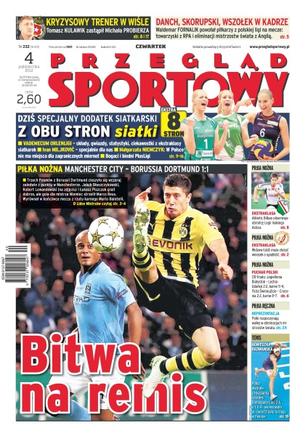 Robert Lewandowski przy stanie 1:0 dla Borussii zmarnował świetną okazję, by zapewnić wygraną swojemu zespołowi; wystarczyła pierwsza porażka w tym sezonie, żeby szkoleniowiec i dyrektor sportowy Bayernu Monachium skoczyli sobie do oczu; aby w tym sezonie walczyć o mistrzostwo Polski w Pluslidze, trzeba mieć budżet przekraczający 10 mln zł; Agnieszka Radwańska pokonała w trzech setach Hiszpankę Lourdes Dominguez-Lino i awansowała do ćwierćfinału; Paweł Kołodziej rozpoczyna najważniejszy okres treningów przed walką, która stworzy mu szansę na starcie o pas mistrza świata IBF; według belgijskich mediów Michał Kwiatkowski miałby zmienić zespół z Omega Pharma na Sky.