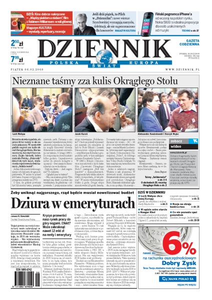 Dziennik dotarł do nagrań zza kulis okrągłego stołu; z powodu kryzysu może zabraknąć 12 mld zł na renty i emerytury; „Washington Times” przekręcił nazwisko Lecha Kaczyńskiego i przedstawił go jako „dziecięcego aktora”; Wałęsa grozi, że porzuci Radę Mędrców; sąd skazał współwinnych katastrofy w kopalni w Rudzie Śląskiej; Rosja coraz bardziej pogrąża się w kryzysie gospodarczym, rubel najsłabszy od kilkunastu lat; 12 spraw, o których Jaruzelski i Kiszczak nie chcą pamiętać. Dodatki: The Wall Street Journal Polska, Warszawa, Kultura, Kultura TV.