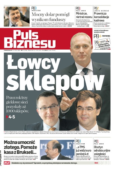 Bomi, Emperia i Eurocash w ciągu roku pozyskały 1000 sklepów na zasadzie franczyzy, pomysły ekonomistów na umocnienie złotówki, Magdalena Gaj – wiceminister infrastruktury – drugą kobietą, która zwalcza TP SA, stan wykorzystania regionalnych programów operacyjnych, dzięki różnicom kursowym fundusze zagraniczne dały zarobić w styczniu ponad 15%, TMS prognozuje euro poniżej 4 zł, pierwsze raporty spółek za IV kwartał nie są wcale katastrofalne.