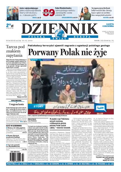 Pakistańscy terroryści ujawnili wczoraj wieczorem nagranie z egzekucji polskiego geologa; komisja ds. służb specjalnych sprawdzi, czy ekipa Donalda Tuska zrobiła wszystko, co mogła, w sprawie porwanego Polaka; nowa administracja USA oficjalnie podtrzymuje wolę budowy w Polsce tarczy antyrakietowej; funkcjonariusze ABW kontrolują kursy prowadzone przez warszawskie Centrum Onkologii; spór z Ministerstwem Kultury o naliczanie wynagrodzeń dla artystów; młodzi ludzie wychowani w wolnej Polsce spierają się o to, jaka jest ich generacja; Kościół chce ekskomuniki biskupa negującego Holokaust.