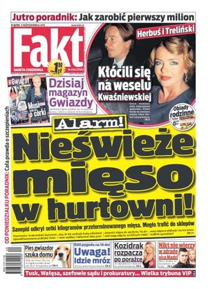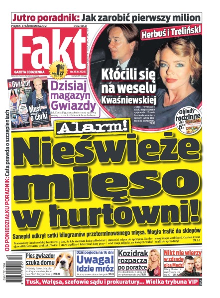 Sanepid odkrył setki kilogramów przeterminowanego mięsa, które mogło trafić do sklepów; Krzysztof Hołowczyc miał wypadek na skuterku; Katarzyna Waśniewska żali się, ża mąż flirtował z inną; Katarzyna Skrzynecka po raz pierwszy pokazuje swój przestronny apartament w Warszawie; Mariusz Treliński i Edyta Herbuś nie są parą od sierpnia, ale na wesele przyszli razem; Jola Rutowicz wróciła; bratanica porucznika Borewicza pokazała nagą pierś; bramkarz Manchesteru City to pewniak w kadrze Anglii; w Polskim Związku Piłki Siatkowej mają już dość rządów obecnego szefa; nowy trener Wisły Kraków raczej kiepsko zna angielski, a w drużynie ma wielu obcokrajowców; Robert Kubica w sezonie 2013 może jeszcze częściej siadać za kierownicą rajdowego auta.