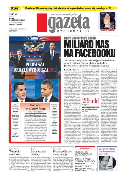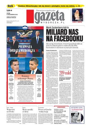 Żelki, czipsy i batony wykańczają nam dzieci – ustawa antyśmieciowa ma zatrzymać epidemię otyłości; kto wygra wyścig o mniej więcej 40 tys. zł, które w świdnickim szpitalu zostawiła zmarła pacjentka – rodzina czy państwo; pierwsza debata w wyborach prezydenckich w USA, która odbyła się w Denver, zakończyła się zdumiewającym, miażdżącym zwycięstwem republikanina Mitta Romneya; od dziś w kinach dokument „Marina Abramović: artystka obecna”; naukowcom z Japonii po raz pierwszy udało się przekształcić komórki skóry w prawidłowe komórki jajowe myszy; wniosek o pomoc z Funduszu Alimentacyjnego można złożyć w każdym czasie – nie zaszkodzi jednak się pospieszyć; do jesieni przyszłego roku pracę może stracić co dziesiąty pracownik autoryzowanych serwisów samochodowych w Polsce.
