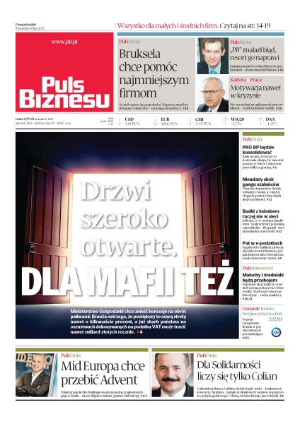 Jak Bruksela chce pomóc najmniejszym firmom; Ministerstwo Gospodarki chce znieść koncesje na obrót paliwami – branża ostrzega, że powiększy to szarą strefę nawet o kilkanaście procent, a już skarb państwa na oszustwach dokonywanych na podatku VAT może tracić nawet miliard złotych rocznie; czterech desperatów chciało wyłudzić z banku 4,5 mld zł; Sygnity było najbliżej zdobycia zlecenia resortu finansów, jednak Krajowa Izba Odwoławcza kazała unieważnić wybór; Mid Europa chce przebić Advent; Solidarność chciało kupić wielu – konkurenci, koncerny, fundusze – jednak do finałowych rozmów dopuszczono jedynie giełdowego Coliana, którym kieruje Jan Kolański.