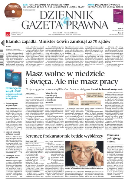 Po cichu, jednym pociągnięciem pióra minister sprawiedliwości zlikwidował w piątek jedną czwartą sądów rejonowych, mimo że zapowiadał likwidację jedynie 29 jednostek; z kraju mogą uciec centra obsługi klientów i finansowo-księgowe – zatrudnienie straci 200 tys. osób; koniec rządowych zleceń na budowę dróg, kolei i lotnisk uderzył nie tylko w firmy budowlane; piłkarscy kibice wyjechali, hotelarze rozpoczęli więc bój o turystów, by nowo pobudowane hotele nie zaczęły świecić pustkami; jak walczyć z opóźnieniami w płatnościach; prokurator generalny Andrzej Seremet nie kryje zaskoczenia tempem przygotowania projektu nowej ustawy o prokuraturze; podwyżka abonamentu spowodowała, że połowa z 14 tys. policyjnych mobilnych terminali trafiła do magazynu.