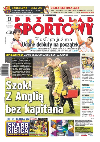 Z Anglią na pewno nie zagra Jakub Błaszczykowski; Gran Derbi zdominowali dwaj najlepsi piłkarze świata – Cristiano Ronaldo i Leo Messi strzelili po dwa gole, więc nic dziwnego, że skończyło się remisem; wrocławska tiki-taka szlifowana przez drużynę Stanislava Levego na treningach powoli przynosi efekty; dziś w Centrum Olimpijskim w Warszawie delegaci wybiorą nowego prezesa PZPS; Serbki, Bułgarki i prawdopodobnie Czeszki będą rywalkami Polek w Schwerinie; kilka dni przed inauguracją Euroligi Asseco Prokom Gdynia szuka optymalnej formy – w sobotę przegrał w Koszalinie; w Japonii Sebastian Vettel odrobił niemal całą stratę do Fernando Alonso.