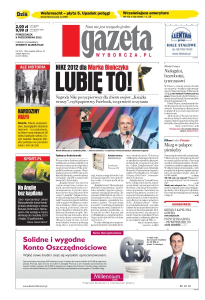 Nagrodę Nike roku 2012 jury pod przewodnictwem Tadeusza Nyczka przyznało Markowi Bieńczykowi za zbiór esejów „Książka twarzy”; sytuacja młodych Polaków pogarsza się szybciej niż ich równolatków w Europie; w 60 miastach Hiszpanie protestowali wczoraj przeciwko rządowi; wcześniejsze emerytury, pomostówki, świadczenia kompensacyjne i przedemerytalne – na jakie pieniądze możesz liczyć, gdy nie masz pracy ani prawa do emerytury; firmy z kapitałem zagranicznym w czasach prosperity napędzają gospodarkę, ale w kryzysie to właśnie globalne koncerny jako pierwsze spowalniają nam produkcję i eksport; już jutro Austriak Felix Baumgartner spróbuje pobić rekord w wysokości skoku na spadochronie, wznosząc się na 36,5km w specjalnej kapsule.