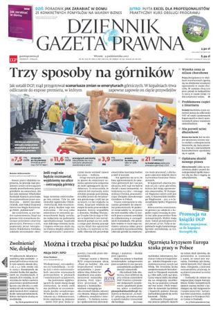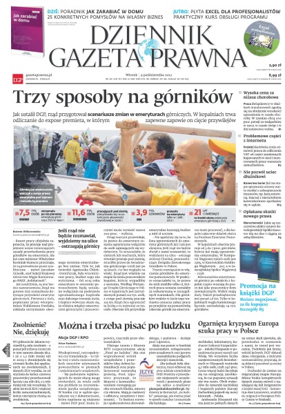 Rząd przygotował scenariusze zmian w emeryturach górniczych – w kopalniach trwa odliczanie do expose premiera, w którym zapewne zapowie on cięcie przywilejów; związkowcy w służbach mundurowych zgodzą się na obniżenie wysokości uposażenia w czasie choroby; skarbówka może odmówić prawa do odliczenia VAT od części zamiennych kupowanych w sieci i montowanych przez warsztaty samochodowe; dlaczego już na etapie spisywania umowy warto myśleć o zabezpieczeniu interesów, np. karą umowną; jakie są rzeczywiste efekty ustawy deweloperskiej; w I półroczu br. lekarze wystawili 8,3 mln zwolnień – o ponad pół miliona mniej niż w tym samym okresie ub.r. i aż o 1,2 mln mniej niż w 2009 r.; architekci, informatycy, kucharze i lektorzy hiszpańskiego – młodzi Hiszpanie w poszukiwaniu pracy ruszyli nad Wisłę.