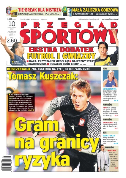 Tomasz Hajto ma zachować posadę do listopada – jeśli jego drużyna przegra z Wisłą lub Lechem, to możliwa jest zmiana; ważą się losy śląskiego klubu – piłkarze zawiesili oficjalne treningi; zgrupowanie reprezentacji Brazylii we Wrocławiu jest dla Kaki szansą, by udowodnić, że na dobre wrócił do wielkiej formy, także w kadrze Canarinhos; Zlatan Ibrahimović nie przyjechał do Paryża tylko po kasę – zarabia 14 milionów euro netto za sezon, ale w wieku 31 lat osiągnął coś, czego nie był w stanie zrobić w żadnym poprzednim klubie; Ashley Cole przeprosił władze angielskiej federacji za obraźliwe komentarze, więc będzie mógł zagrać z San Marino i Polską; Stal Gorzów pokonała Azoty Tauron Tarnów 47:42 w pierwszym spotkaniu finałowym; Ferrari zapewnia, że wciąż kontroluje sytuację w mistrzostwach, ale to tylko dobra mina do złej gry – nie ma wątpliwości, że faworytem jest Red Bull.