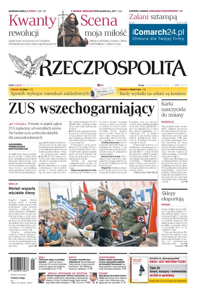 Gospodarcza ofensywa PiS zmusiła partie do zajęcia się problemami polskiego biznesu; Tusk szuka pieniędzy w kieszeniach studentów – chce, żeby płacili składki od umów-zleceń; siedem tysięcy policjantów broniło wczoraj niemieckiej kanclerz przed tłumem niezadowolonych Greków; jak ultraortodoksyjni Żydzi walczą z nowoczesnymi komórkami; Nobel z fizyki trafi do Amerykanina i Francuza za prace nad naturą światła i materii; Przemysław Tytoń, bramkarz reprezentacji Polski, o Anglii, ławce rezerwowych i karnych Rooneya; należności Skarbu Państwa rosną coraz szybciej. To z powodu większych zaległości w płaceniu podatków oraz kolejnych pożyczek budżetu dla FUS.