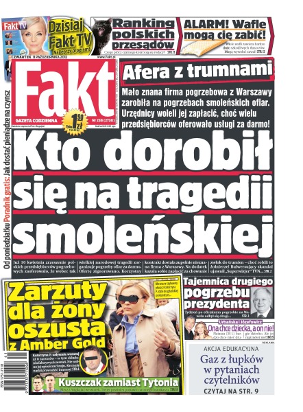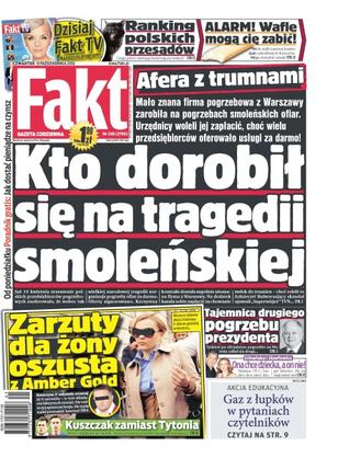 Mało znana firma pogrzebowa z Warszawy zarobiła na pogrzebach smoleńskich ofiar – urzędnicy woleli jej zapłacić, choć wielu przedsiębiorców oferowało usługi za darmo; Katarzyna P. zdaniem śledczych, kiwała sąd i skarbówkę; jak Tusk walczy o odzyskanie poparcia; naukowcy ustalili już, jak zmieni się wygląd ludzi w drodze ewolucji; ten rok jest dla Edyty Górniak wyjątkowy – płyta, dom i urodziny; Janusz Józefowicz nie chce słyszeć o kolejnym urlopie macierzyńskim żony; dlaczego selekcjonera biało-czerwonych denerwuje widok kręcących się po hotelu piłkarskich menedżerów; FIVB żąda od polskiego klubu ekstraopłaty za transfer kubańskiej siatkarki.