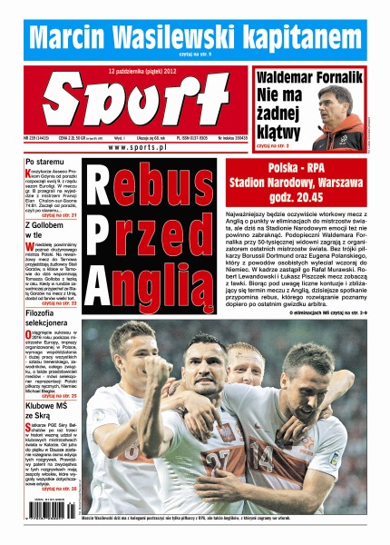 Eugen Polanski opuścił wczoraj zgrupowanie, a w jego miejsce przyjechał do Warszawy Rafał Murawski; Republika Południowej Afryki to pod wieloma względami potentat na „Czarnym lądzie” – jeśli jednak chodzi o futbol, to mimo wielkich pieniędzy i nowoczesnych stadionów, „Bafana Bafana” grają poniżej oczekiwań; licząc oficjalne i nieoficjalne spotkania Argentyny z Urugwajem, w nocy z piątku na sobotę oba zespoły zmierzą się już po raz dwusetny; Jacek Będzikowski będzie asystentem nowego trenera męskiej reprezentacji, Michaela Bieglera; siatkarze PGE Skry Bełchatów po raz trzeci w historii wezmą udział w klubowych mistrzostwach świata w Katarze.