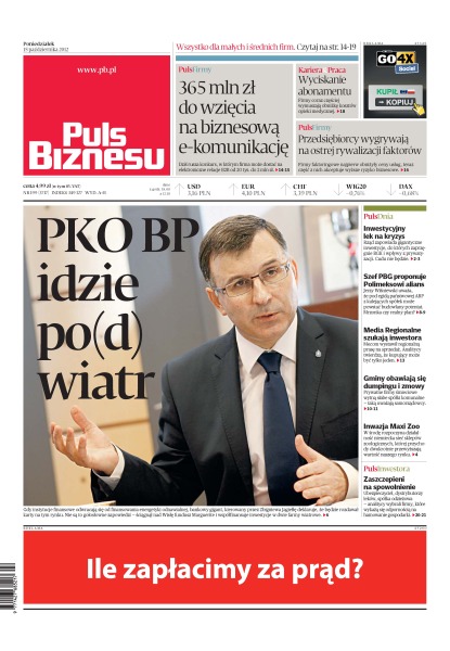 Dlaczego firmy coraz częściej wymuszają obniżkę kosztów opieki medycznej; firmy faktoringowe najpierw obniżyły ceny usług, teraz część z nich akceptuje wyższe ryzyko biznesowe; gdy instytucje finansowe odwracają się od finansowania energetyki odnawialnej, bankowy gigant, kierowany przez Zbigniewa Jagiełłę deklaruje, że będzie rozdawał karty na tym rynku; rząd zapowiada gigantyczne inwestycje, do których zaprzęgnie BGK i wpływy z prywatyzacji; Szef PBG proponuje Polimeksowi alians; Mecom wystawił regionalną prasę na sprzedaż – analitycy twierdzą, że kupujący może być tylko jeden; czy prywatne firmy śmieciowe wytną słabe spółki komunalne; w środę rozpoczyna działalność niemiecka sieć sklepów zoologicznych, której przychody dwukrotnie przewyższają wartość naszego rynku.