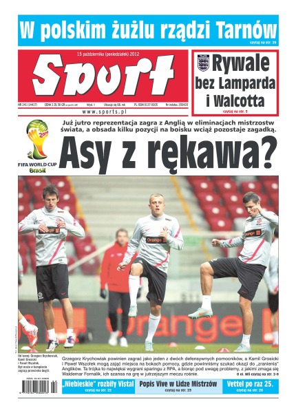 Już jutro reprezentacja zagra z Anglią w eliminacjach mistrzostw świata, a obsada kilku pozycji na boisku wciąż pozostaje zagadką; piątkowe gole znów umocniły wiarę w siebie Wayne’a Rooneya; Frank Lampard nie zdążył wyleczyć kontuzji łydki i nie zagra przeciwko Polsce; szczypiorniści Vive Targów Kielce odnieśli trzecie zwycięstwo z rzędu; fatalne przyjęcie, mizerna siła ataku – tak prezentował się zespół Atomu Trefla, dlatego trener Jerzy Matlak miał prawo się pieklić; Sebastian Vettel ponownie zdobył Korean Grand Prix i po 25. zwycięstwie w karierze, a trzecim z rzędu, objął prowadzenie w mistrzostwach świata F1; jeźdźcy Azotów Tauron Tarnów po raz trzeci w historii zostali drużynowymi mistrzami Polski; Anna Szafraniec pokonała Rosjankę Irinę Kalentiewą i Kanadyjkę Catharine Pendrel – i wygrała wyścig Roc d’Azur, który kończy sezon w kolarstwie górskim.