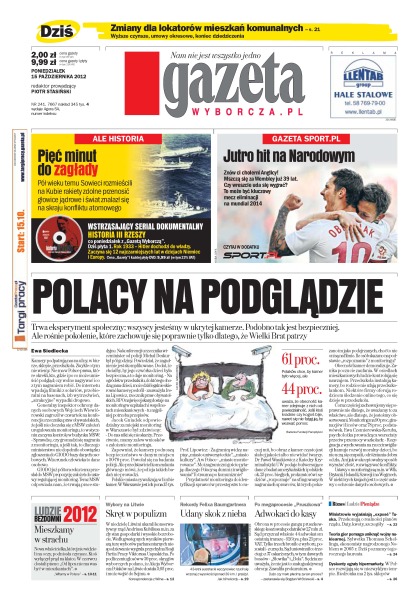 Obrona oskarżonych w procesie gangu pruszkowskiego kosztowała podatników 2,7 mln zł – sąd przyznał właśnie 44 adwokatom ostatnią transzę – 926 tys. zł plus VAT; ugrupowanie Viktorasa Uspaskicha wygrało według wstępnych danych wybory parlamentarne na Litwie; „Danuta W.” to najbardziej polityczne przedstawienie w karierze Krystyny Jandy; dlaczego lata na Spitsbergenie są dziś cieplejsze niż za wikingów, którzy zasiedlali Grenlandię; lokatorów mieszkań komunalnych czekają zmiany; w przyszłym roku rząd chce sprywatyzować majątek nawet za ponad 20 mld zł; z planowanych na Euro 144 kilometrów autostrady na Podkarpaciu do użytku oddano niecałe 7 km.