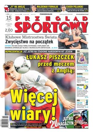 Od Lewandowskiego oczekujemy wreszcie goli, od Wszołka i Grosickiego skutecznych rajdów, od Obraniaka, by pod nieobecność Błaszczykowskiego został liderem drugiej linii – oto, jak według nas, powinna wyglądać jedenastka na Anglię; do biało-czerwonych dziś ma dołączyć Eugen Polanski, który wcześniej opuścił zespół z powodów rodzinnych; Wayne Rooney wyprzedził Alana Shearera na liście najlepszych strzelców, a Franka Lamparda – w kolejce do bycia kapitanem; PGE Skra Bełchatów kontra Zenit Kazań – dziś w Katarze kolejna odsłona najbardziej elektryzującej rywalizacji ostatnich lat; Lance Armstrong utracił większość tytułów, dobrą opinię i przyjaciół; Urszula Radwańska ostatni start w sezonie zaczyna od walki z weteranką Francescą Schiavone; Sebastian Vettel odniósł trzecie zwycięstwo z rzędu i objął prowadzenie w mistrzostwach świata, a Red Bull odzyskał dominującą pozycję.