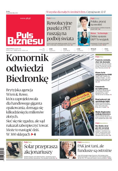 Invento opracowało plastikową puszkę – w 2011 r. sprzedało 0,5 mln sztuk, w przyszłym chce 11 mln; brytyjska agencja Wren & Rowe, która zaprojektowała dla Biedronki opakowania, domaga się kilkudziesięciu milionów złotych – sieć się nie zgadza, ale sąd nakazał zabezpieczyć towar; zegarki, jadło i napitki oraz miesiące wolnego – te i inne przywileje załogi węglowego holdingu zakwestionowała NIK; w lecie firmy zamiast zatrudniać zwalniały – w trzecim kwartale aż 17 tys. osób – tak źle nie było od dekady; rząd pokazał, jak opodatkuje łupki; Mecom wystawił regionalną prasę na sprzedaż – kupiec może być w zasadzie tylko jeden; Solar przeprasza akcjonariuszy.