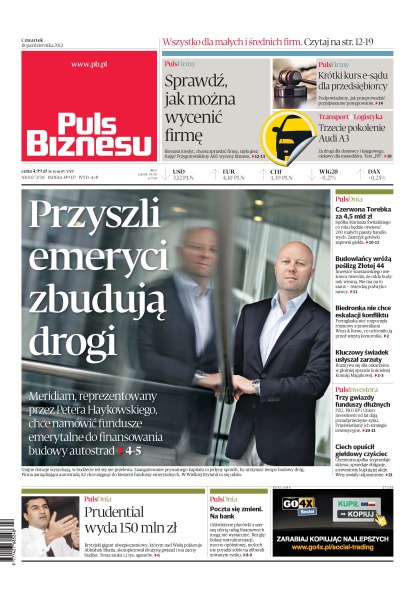 ABC wyceny biznesu; jak przeprowadzić przyśpieszone postępowanie; Audi A3 – za drogie dla dostawcy i księgowego, ciekawe dla menedżera; Meridiam, reprezentowany przez Petera Haykowskiego, chce namówić fundusze emerytalne do finansowania budowy autostrad; spółka Mariusza Świtalskiego co roku będzie otwierać 200 małych pasaży handlowych; dlaczego budowlańcy wróżą poślizg Złotej 44; Biedronka rozpoczęła rozmowy z prawnikami Wren & Rowe, co uchroniło ją przed wizytą komornika; rozmywa się siła oskarżenia w głośniej sprawie kościelnej Komisji Majątkowej; PZU, PKO BP i Union Investment od lat dają ponadprzeciętne zyski; brytyjski gigant ubezpieczeniowy, którym nad Wisłą pokieruje Abhishek Bhatia, skompletował drużynę gwiazd i ma zacny budżet.