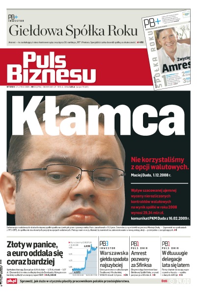 W grudniu Maciej Duda mówił, że jego spółka nie ma otwartych pozycji na opcjach walutowych – a wczoraj w komunikacie ujawniono 29 mln zł strat, NBP przedstawił raport na temat wprowadzenia w Polsce euro, założyciel Sfinksa pozwał Amrest do sądu, BBI Capital NFI chce uratować Dudę-Bis, spekulanci bawią się złotówką – teoretyczny scenariusz postępowania. Wydanie zawiera dodatek Giełdowa Spółka Roku.