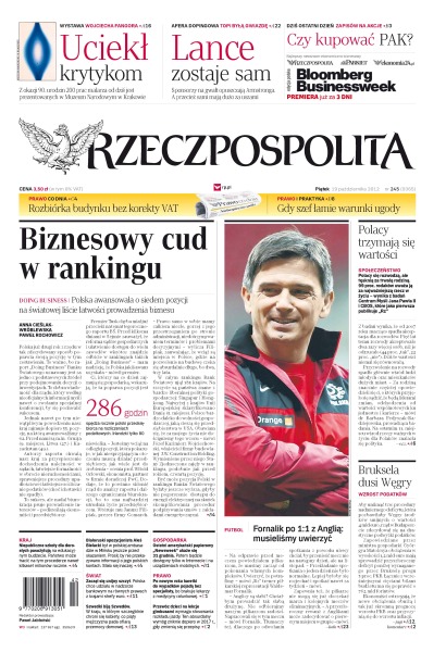 Polska awansowała o siedem pozycji na światowej liście łatwości prowadzenia biznesu; budżet traci majątek na edukacji wirtualnych uczniów w szkołach dla dorosłych; młodzi internauci w niedzielę zapalą setki zniczy pamięci – przypomną o zagładzie polskich elit; Polska chce udziału w nadzorze bankowym na równych prawach z krajami strefy euro; rząd w Budapeszcie broni się przed utratą funduszy europejskich podwyżką większości podatków; z okazji 90. urodzin Wojciecha Fangora Muzeum Narodowe w Krakowie prezentuje od dziś 200 jego obrazów; nad nową generacją automatów samodzielnie oceniających otoczenie, radzących sobie w różnych sytuacjach pracują amerykańscy naukowcy; Waldemar Fornalik, trener reprezentacji Polski, o remisie z Anglią, dziurawym dachu i bezczelności.