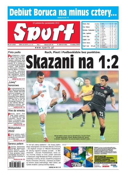 Artur Boruc po niespełna pół roku wrócił do bronienia. Efekt? Cztery piłki za jego plecami i wysoka porażka Southamptonu z West Hamem; po przegranej u siebie z Cracovią 1:2 piłkarze lidera I ligi, Floty Świnoujście zakończyli serię 19. kolejnych meczów bez porażki; bez kontuzjowanych Kuby Błaszczykowskiego i Mario Goetze Borussia Dortmund przegrała u siebie z Schalke 1:2; piłkarze ręczni Vive Targi Kielce pokonali na wyjeździe francuski Chambery Savoie HB 36:26; Kraków i okolice, wspólnie ze Słowacją, będą się starać o zimowe igrzyska w 2022 roku.