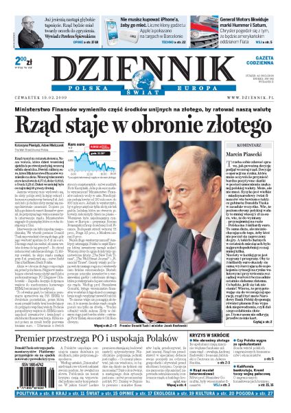 Ministerstwo Finansów wymieniło część środków unijnych na złotego, by ratować polską walutę; jak zagraniczni eksperci oceniają ingerencję polskiego rządu na rynku walutowym; Jarosław Gowin wypowiada się na temat sporu w PO dotyczącego zapłodnienia in vitro; słaba widoczność, duża mgła i obfity śnieg - to według ekspertów główne przyczyny wypadku śmigłowca w Jarostowie; podczas kryzysu w latach 30. XX wieku największymi ofiarami byli najmłodsi, czy teraz będzie podobnie; Kalifornia, najbogatszy stan Ameryki dorobił się 42 miliardów dolarów deficytu.