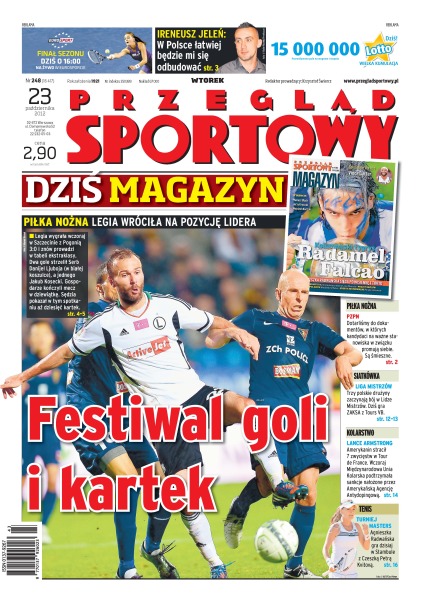 Legia wygrała wczoraj w Szczecinie z Pogonią 3:0 i znów prowadzi w tabeli ekstraklasy; PS dotarł do dokumentów, w których kandydaci na ważne stanowiska PZPN promują siebie; trzy polskie drużyny siatkarskie zaczynają bój w Lidze Mistrzów, dziś gra ZAKSA z Tours VB; Lance Armstrong stracił 7 zwycięstw w Tour de France, wczoraj Międzynarodowa Unia Kolarska podtrzymała sankcje nałożone przez Amerykańską Agencję Antydopingową; Agnieszka Radwańska gra dzisiaj w Stambule z Czeszką Petrą Kvitovą.