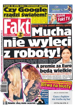 Donald Tusk nie zwolnił ministry sportu; Jarosław Gowin dla Faktu: „celowo chcą mnie oczernić”; czy Google rządzi światem; drogi Marty Kaczyńskiej i jej męża biegną już w innym kierunku – teraz łączą ich tylko dzieci; koniec telewizji analogowej – ale nie trzeba kupować drogiego telewizora; wierni zapłacą za pijacki wybryk biskupa; wielki ranking Faktu – zobacz co najczęściej kradnie się w Polsce.