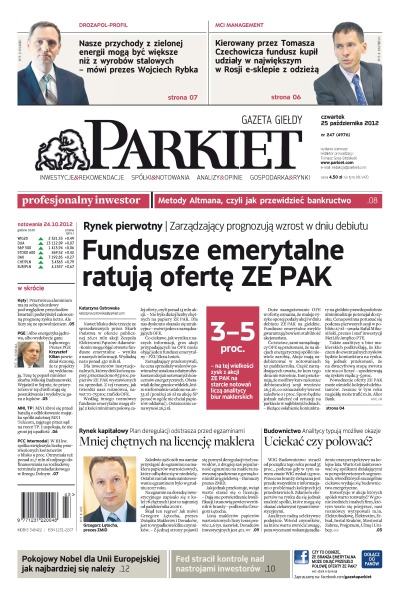 Fundusze emerytalne ratują ofertę ZE PAK – zarządzający prognozują wzrost w dniu debiutu; miej chętnych na licencję maklera – plan deregulacji odstrasza przed egzaminami; WIG -Budownictwo stracił od początku tego roku ponad 35 proc. uciekać czy polować; kierowany przez Tomasza Czechowicza fundusz MCI Management kupił udziały w największym w Rosji e-sklepie z odzieżą.