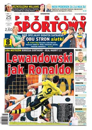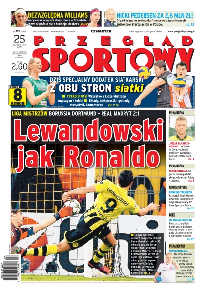 Borussia – Real 2:1 – po bramce Roberta Lewandowskiego mistrz Niemiec uwierzył w pokonanie Królewskich; Jakub Błaszczykowski miał pauzować sześć tygodni, ale być może zagra już w rewanżu z Realem Madryt; jesteśmy przybici, zabrakło nam 30 sekund do remisu – płakali po porażce na Camp Nou 1:2 piłkarze Celticu; PGE Skra Bełchatów kapitalnie rozpoczęła sezon – ilne Fenerbahce pobite 3:0; Władymira Kliczkę w walce z Mariuszem Wachem poprowadzi Jonathon Banks, były rywal... Tomasza Adamka.