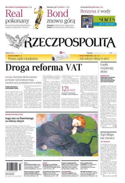 Droga reforma VAT – korzystne dla firm zmiany pochopnie wprowadzane mogą zamienić życie przedsiębiorców w piekło; zapowiadana od lat przez rząd budowa polskiej elektrowni jądrowej staje pod znakiem zapytania; PiS chce rozliczyć b. ministra skarbu Aleksandra Grada za dzierżawę majątku zlikwidowanej Stoczni Szczecińskiej; prezes sądu z konkursu; jak założyć sklep w sieci; Borussia Dortmund w Lidze Mistrzów wygrała 2:1 z gwiazdami z Madrytu.